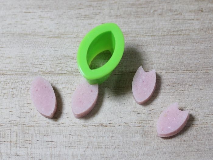 手足もソーセージを型で抜きます。今回は葉っぱみたいな型を使っていますが楕円、しずく型などでもOK。同じ型で指先(?)の切り込みを入れていますがこちらもナイフでも。