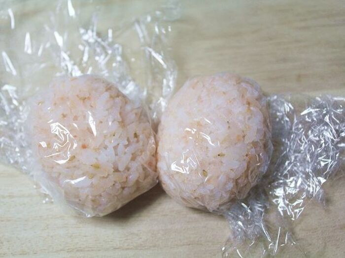 ご飯にさけふりかけを混ぜ、ラップに包んでちょっと丸めの俵型に握ります。