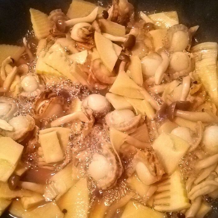 フツフツとしたら筍を投入。少し味が回ったらベビーほたてとしめじをいれて煮ます。