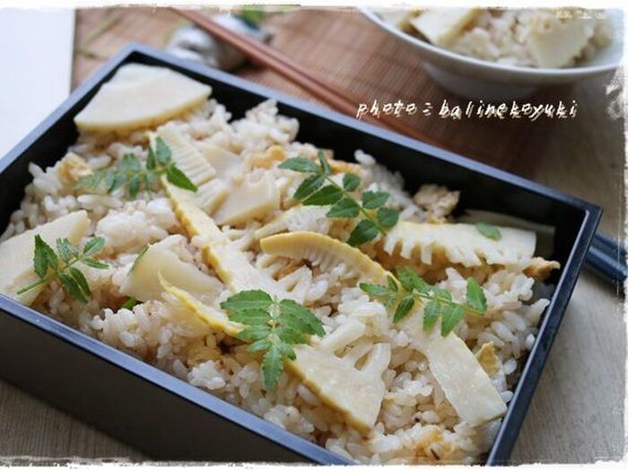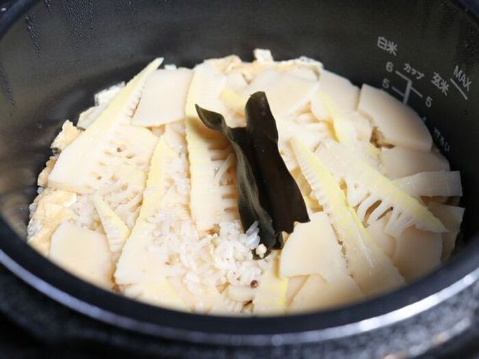 米の水気をしっかり切り、炊飯器にいれ、出汁、酒、薄口醤油、みりん、塩を入れさっと混ぜあわせ油揚げ、筍を乗せ昆布を乗せて炊く。