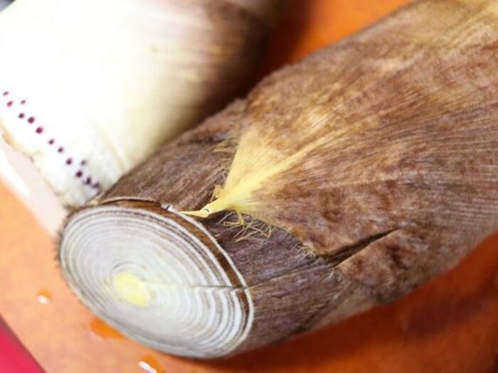 筍は土を落としてよく洗い、穂先を斜めに切り落とす。切り取った部分にまっすぐ切れ目を入れます。