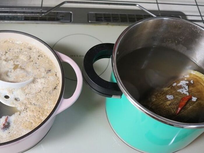 鍋に筍と米ぬかと唐辛子を入れます。落とし蓋をし、蓋をして中火で沸騰するまで茹でる。沸騰したら弱火にし、蓋をずらして1時間半~2時間茹でる。(水分が減ってきたらさし水を入れる)