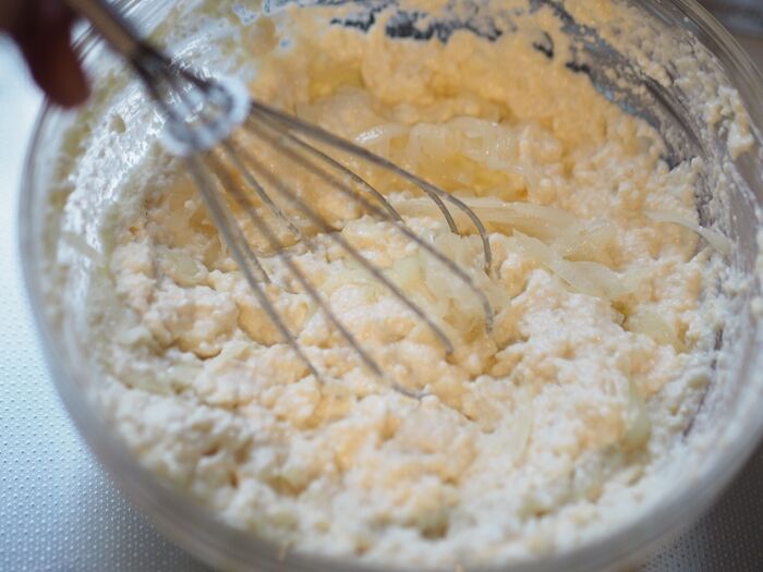 4、ボウルに1の水切りした豆腐を入れ、塩こしょう、マヨネーズ、3の玉ねぎを入れてよく混ぜます。