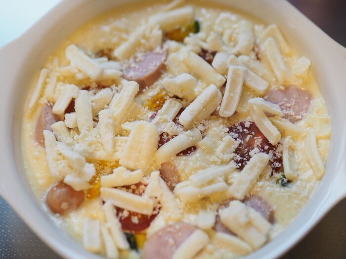 6、5の生地を耐熱容器に流し込み、2の具材を入れて、その上にピザ用チーズをのせ、粉チーズ(分量外)をふりかけます。