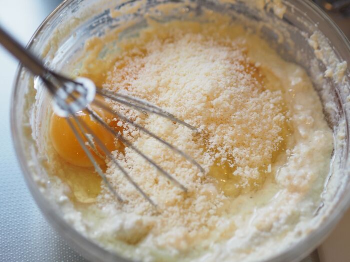 5、4に粉チーズ、卵を入れてさらによく混ぜ合わせます。