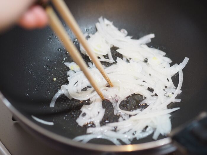 3、オリーブオイルを熱したフライパンに薄切りした玉ねぎを軽く炒めます。