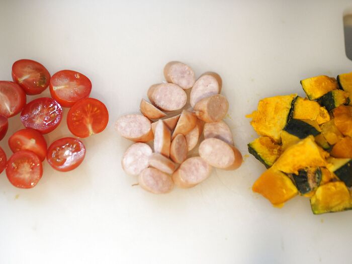 2、キッシュに入れるミニトマト、ウインナー、かぼちゃをそれぞれ食べやすい大きさに切ります。