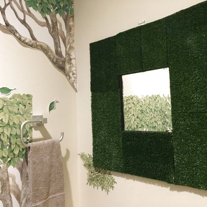 人工芝はseriaのものがちょうどミラーの枠の2倍の幅だったので、半分に切って貼っていきました。長さが足りない部分は貼りあわせて。手作り感満載で味が出たと思います。