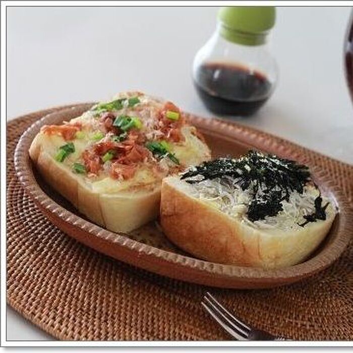①お好きなパンに、とろけるチーズをのせ、かつおぶし、はちみつ梅をちぎって散らして、ねぎも小口切りにして散らします。