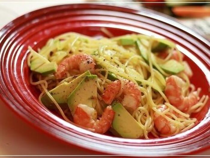 ③ボウルに茹であがった①を入れ、えび、アボカド、白だし、オリーブ油を入れてよく混ぜる。