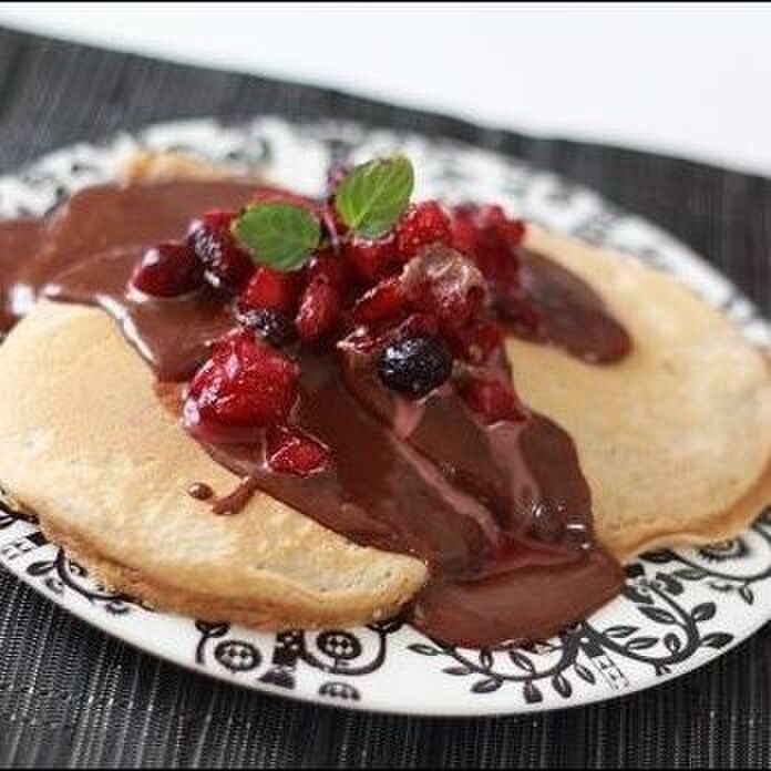 ⑤ボウルに、板チョコを適当な大きさに割って入れ、生クリームを入れて湯煎で溶かしていきます。(フライパンにお湯をはって加熱しながら湯煎で溶かしていきます。)じっくり溶かしながら、まんべんなく混ぜて溶けたら、④のホットケーキの上からかけて、①のラズベリーをのせて盛りつけ、ミントを飾っていただきます。