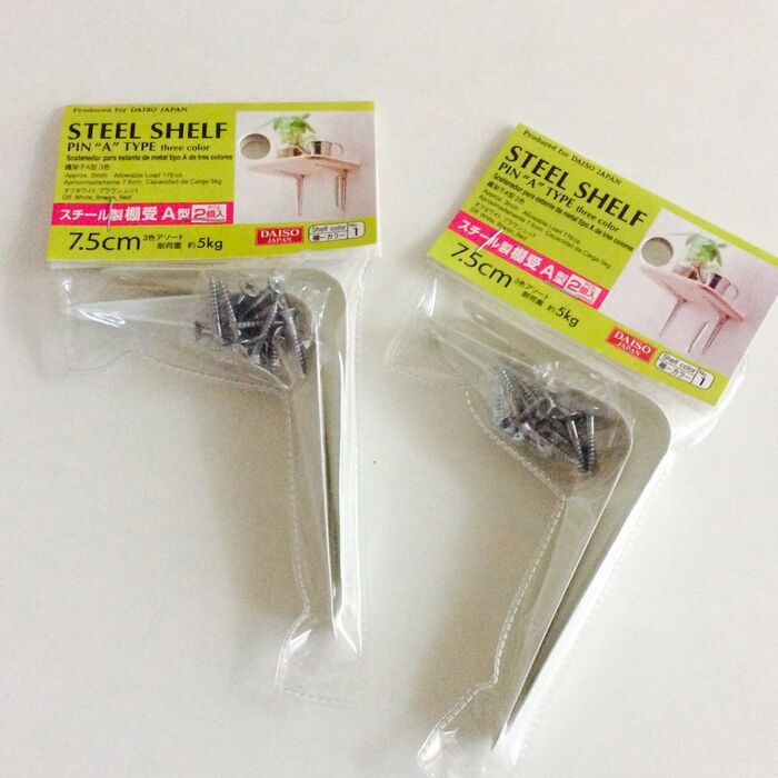 その後、先に棚になる木材に受け金具を取り付け、棚受けの金具が付いた板を持って(取り付け位置に印→下穴にあらかじめ穴を開ける)ディアウォールの柱に後からつける。