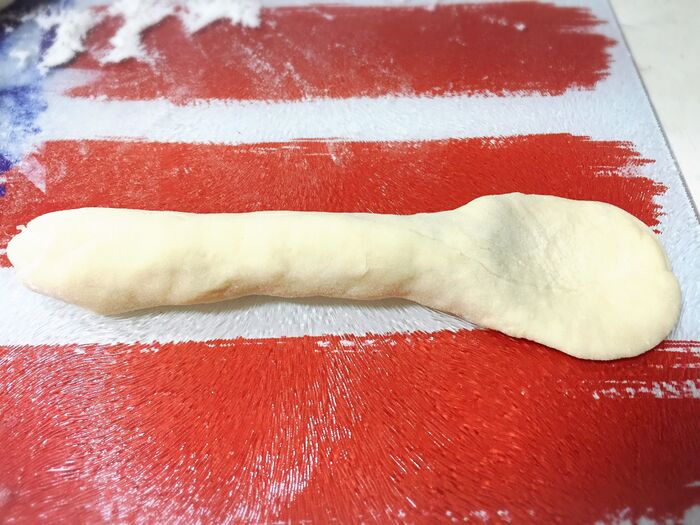 手でクルクル転がして長さ20cmくらいにして、片方だけ先の方を潰します。