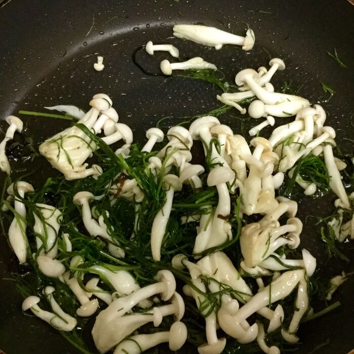 おかひじきとぶなぴーを、塩昆布を加えて炒めます。