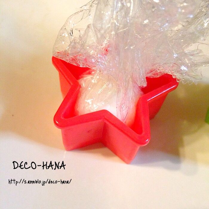 卵が温かいうちにラップに包み、星型に詰めます。