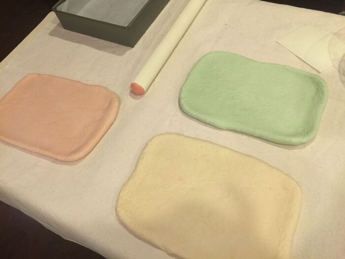 斜め右上、斜め右下、斜め左上、斜め左下の順に麺棒をあてて厚みが均等な長方形にする。