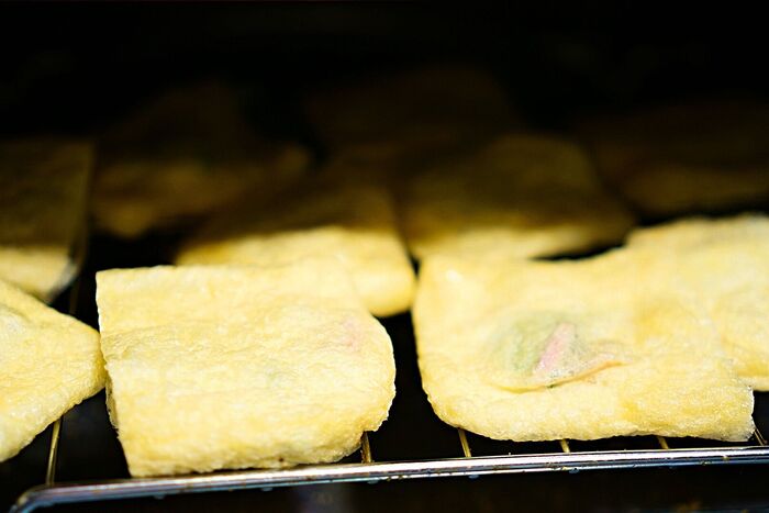 ①油抜きをした油揚げを半分に切り、くっついた部分を開いて袋状にします。