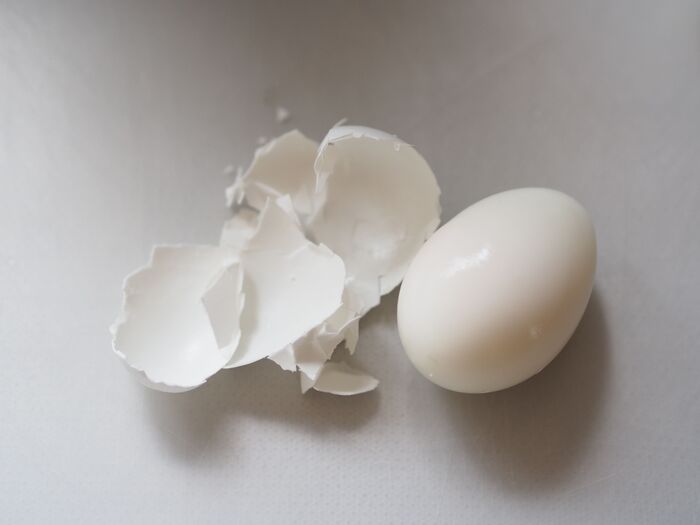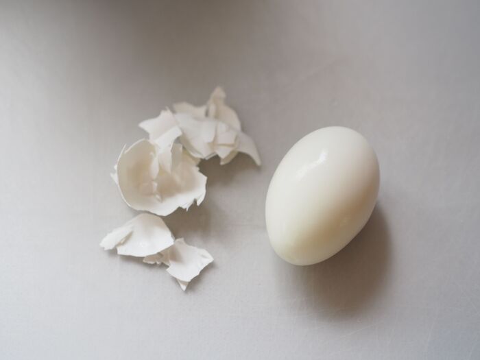 1つ目は、茹でる前に生卵のおしり部分(尖っていない方)に画鋲を回しながら刺し、抜きます。その後はいつものように茹で、茹で上がったら固いところに当ててひびを入れ、そこから殻をむきます。