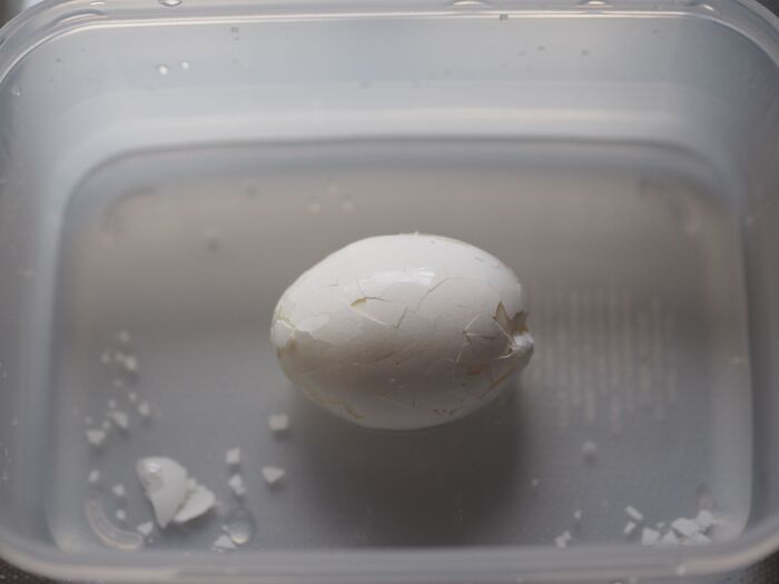 3つ目は、タッパーなどの容器にゆで卵と少量の水を入れてふたをします。それをいきおいよくシャカシャカと振れば完了です!