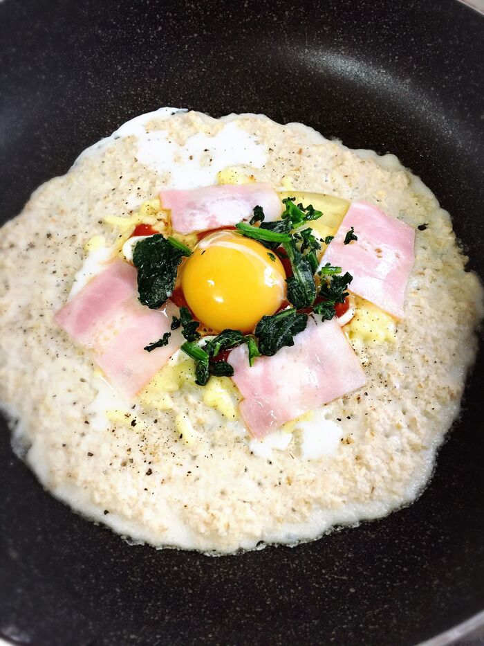 真ん中に卵を割りいれベーコン、ほうれん草をのせます。