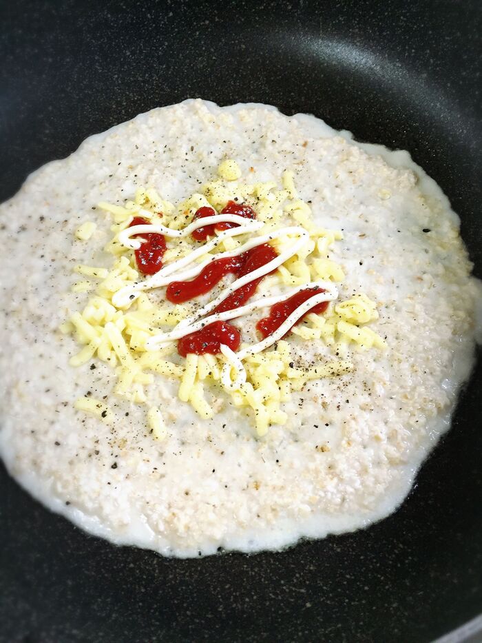 ケチャップ、マヨネーズを土手の中に適量入れて生地全体にブラックペッパーをかけます。