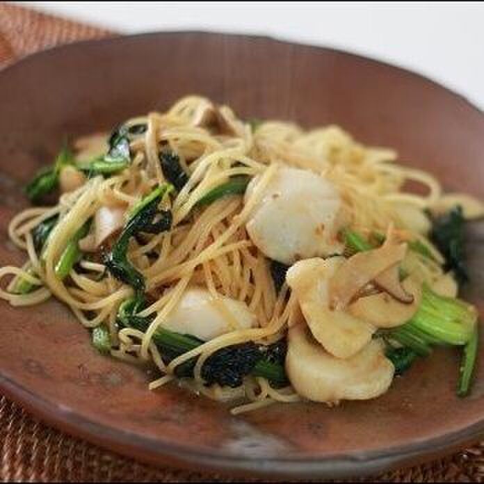 ほたては火を通しすぎず、さっと炒め、調味して全体に混ぜ、器に盛ります。