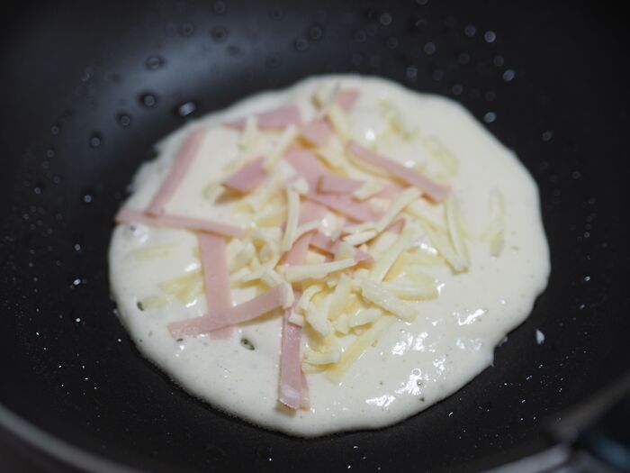 2、中火で熱したフライパンに1の生地を薄めに流し込み、薄切りしたハム、ピザ用チーズをのせて焼きます。