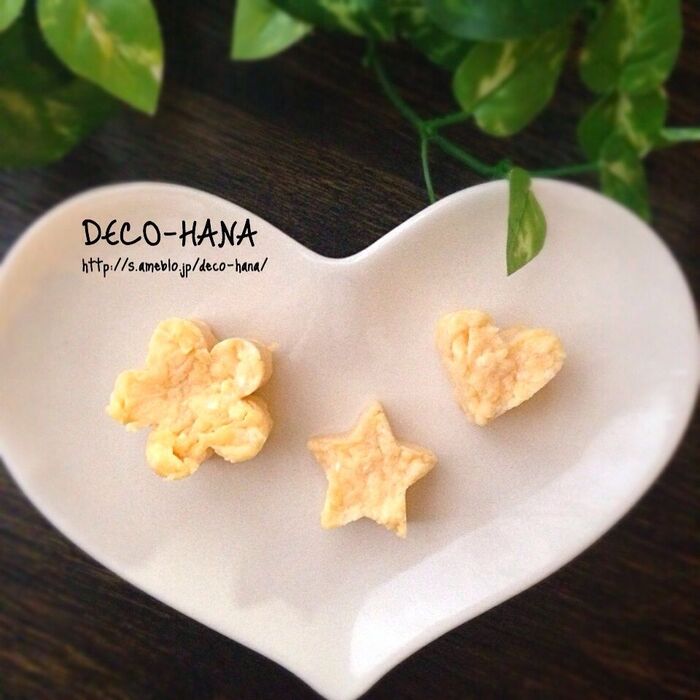 ラップの上に置いた抜き型に、温かいスクランブルエッグを詰める。