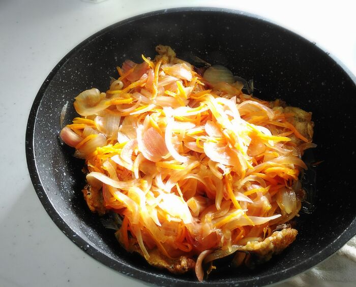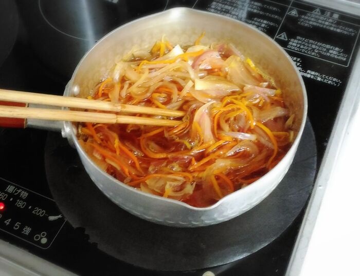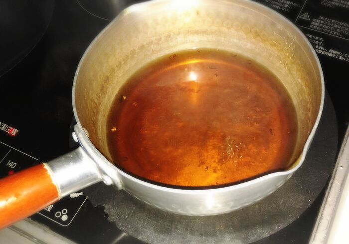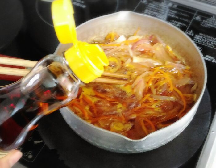 だし汁、醤油、砂糖、酢を入れ煮立たせる。