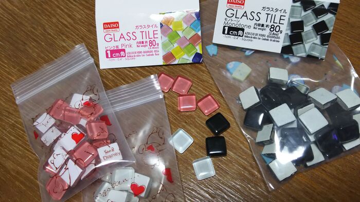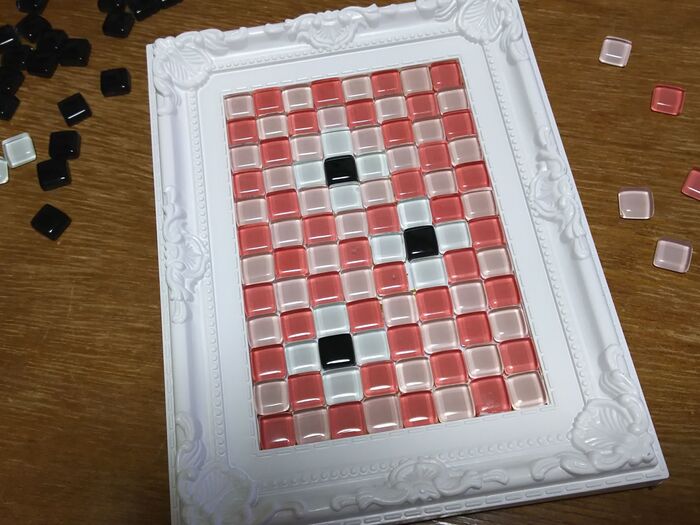 ガラスタイル1㎝角はそれぞれわずかに大きさが違っていたので、フレームに収まらなかったり、隙間が開いたりしました。仮おきしてみてキレイにおさまるように配置変えをオススメします。