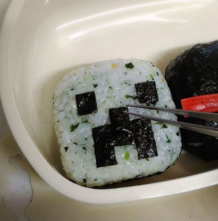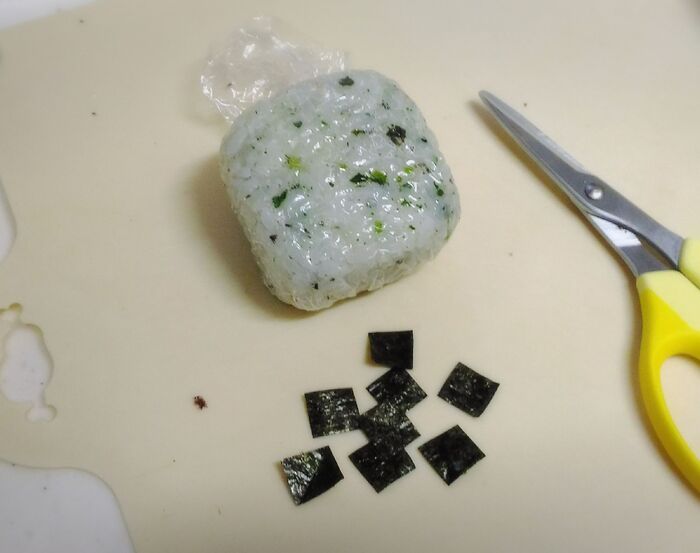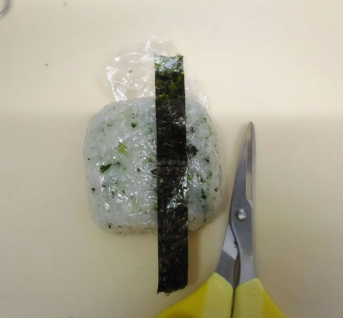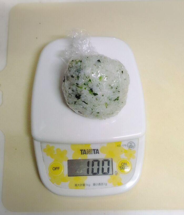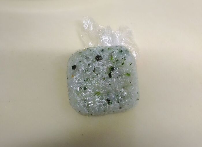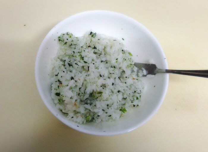 ご飯に緑系の混ぜご飯の素を混ぜます。