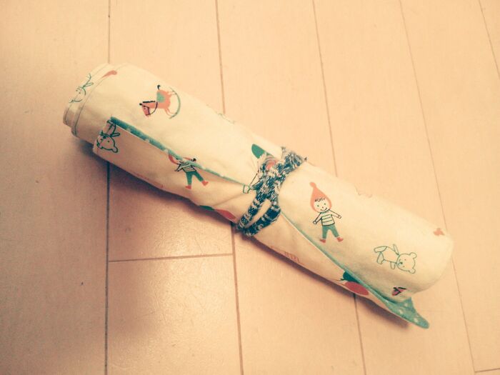 にしてひもを挟んで縫う。裏返してもう一周縫う。