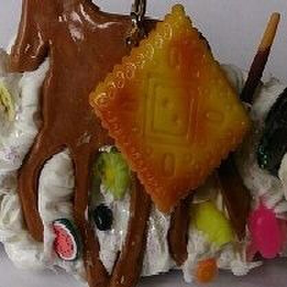 バレッタにクリーム絞りに入れたシリコンクリームをのせ、馬のクッキーを中心にダイソーのジェリービーンズやフルーツなど飾って出来上がり。