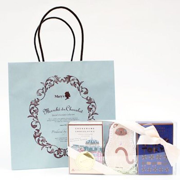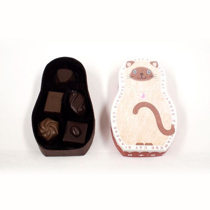 シャム猫をモチーフにデザインさえた可愛いパッケージ。こちらは一口チョコが5つ詰め合わせになっています。