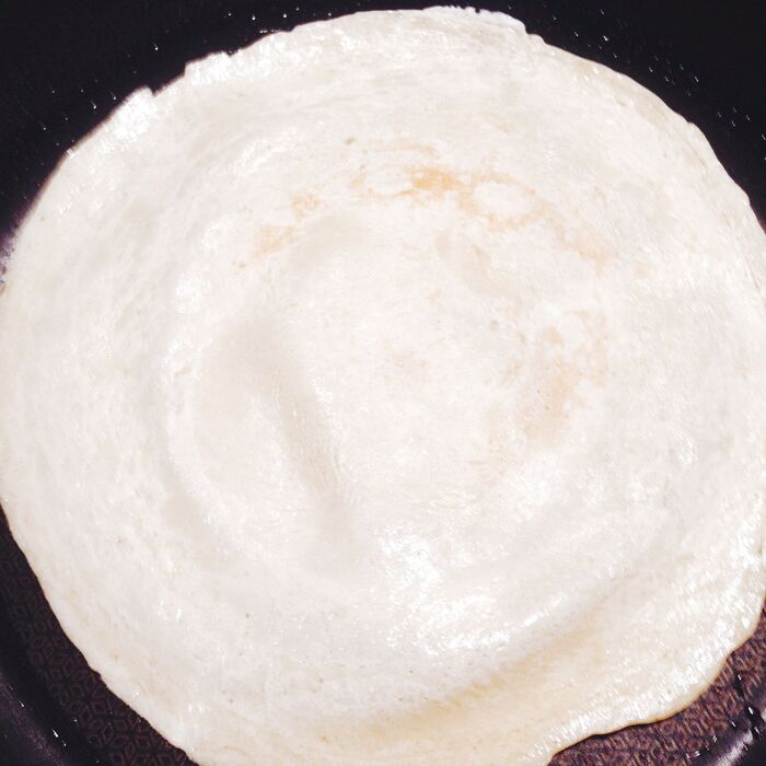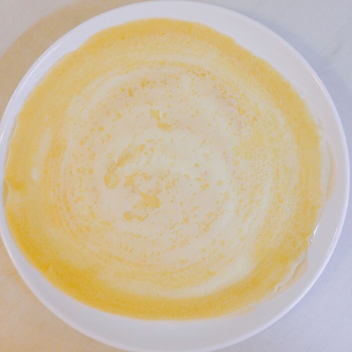 そこに、おたまで一杯分をクレープ生地を流し込み、薄く伸ばします。