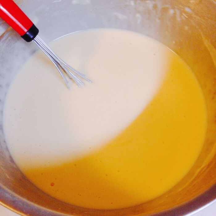 さらに牛乳を少しずつ加え、なめらかになるまでよく混ぜ合わせます。