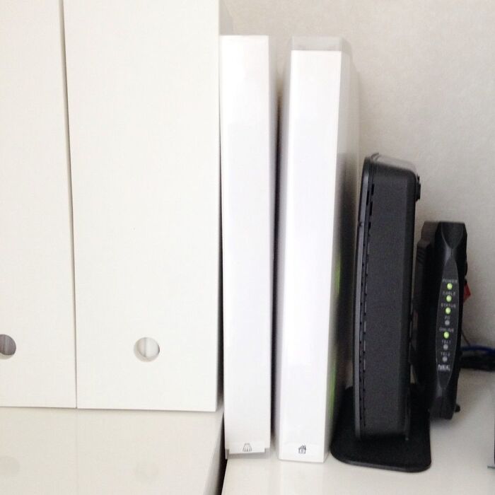 ファイルボックスに入れて隠すことでスッキリします。(ホコリ除けにも効果ありです)