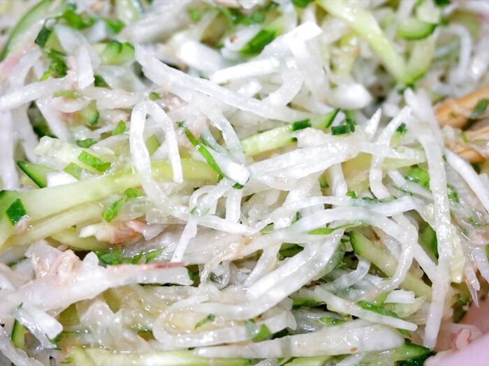 ドレッシングは食べる直前に和えると大根のシャキシャキ感を楽しめます♪