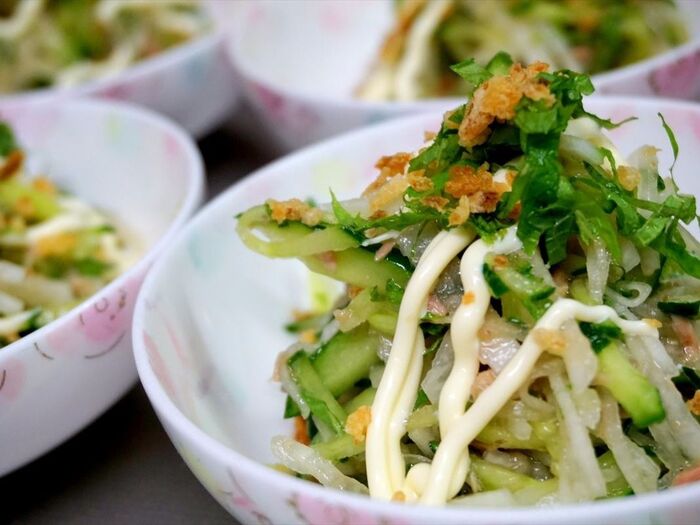 元々は大根、大葉、ツナと野菜系ドレッシングを和えていましたがそのときある野菜をプラスするのもOK。今回は胡瓜があったので入れましたが水菜やシメジなども入れたりもします。オクラはとろみがついて口当たりが良く、また違った美味しさになります。元々シンプルなものなのでアレンジも自由自在です。