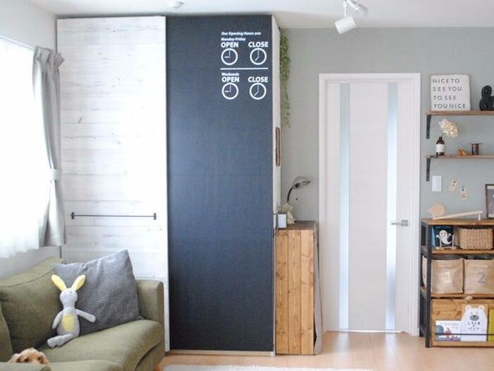 黒板加工を施した大型収納の上部分に、白いウォールステッカーを貼ってチョークで書いたような仕上がりに。サイズが大きくのっぺりしがちな場所に、ステッカーでポイントを与えています。