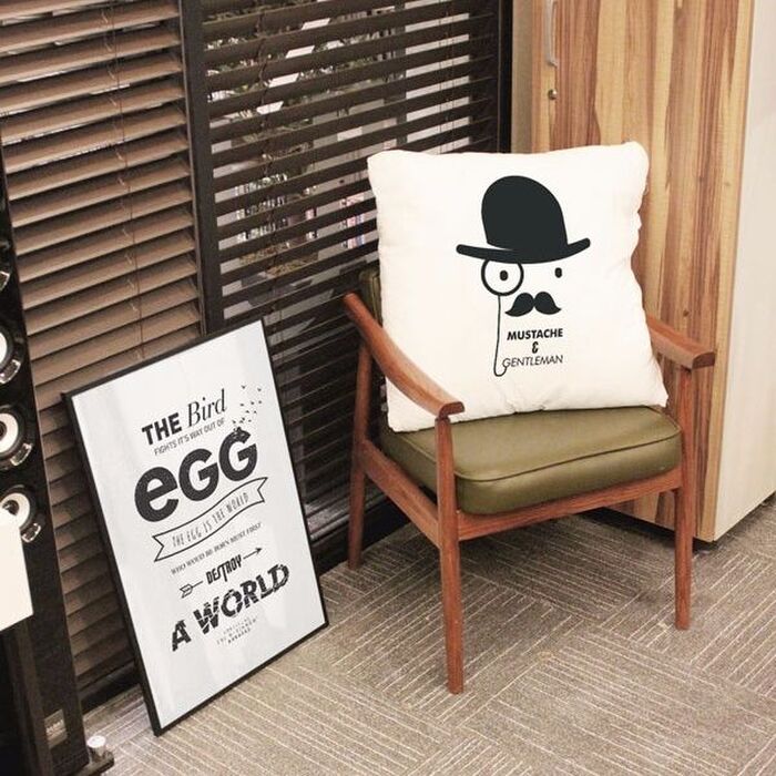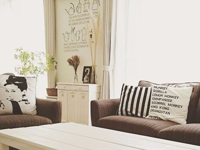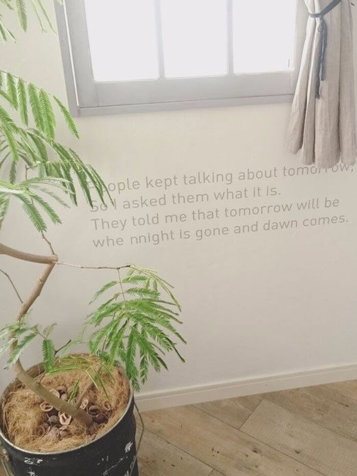 代表的なデッドスペースでもある、窓の上の梁部分を利用したアレンジ!テキストタイプのウォールステッカーなので、派手になりすぎず個性的に空間を彩っています。