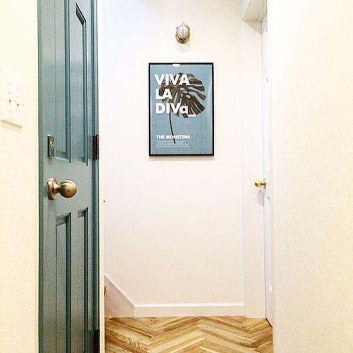 廊下正面、階段へと上がる踊り場に、1点飾られたパネルアイテムが映えます。他の家具と色味を合わせることで空間にもよくなじみ、ポイントながらもメインインテリアのように空間を彩ります。