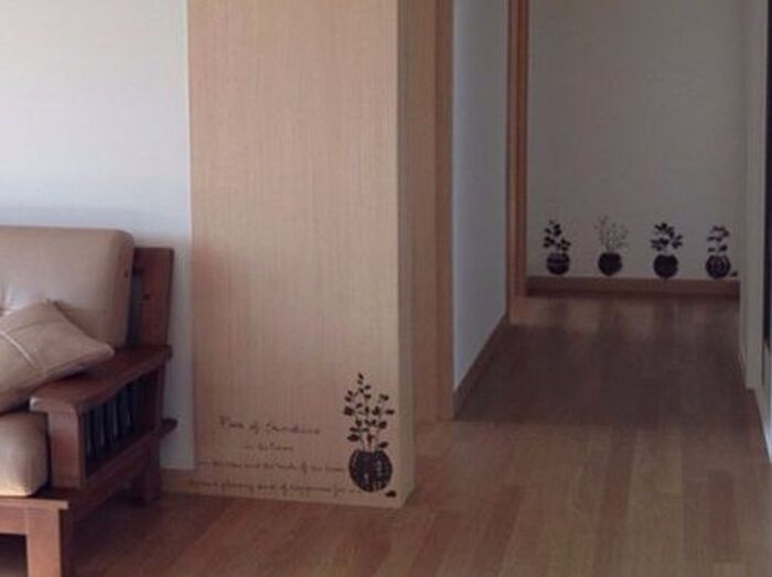 リビングと奥の廊下にわけてステッカーを貼った、遊び心たっぷりのアレンジ。デッドスペースになりがちな空間の足元スペースも、これなら楽しく飾れますよね。