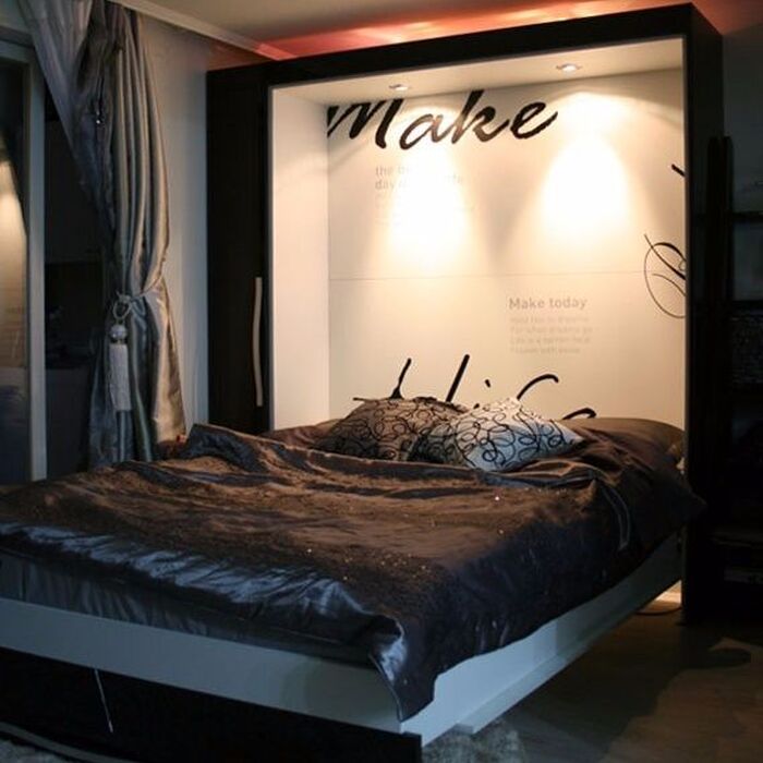 収納式ベッドを出した時に見える、スペースを利用したアレンジ。ウォールステッカーをバランスよく貼りつけて、高級感のあるラグジュアリーな雰囲気に仕上がっています。