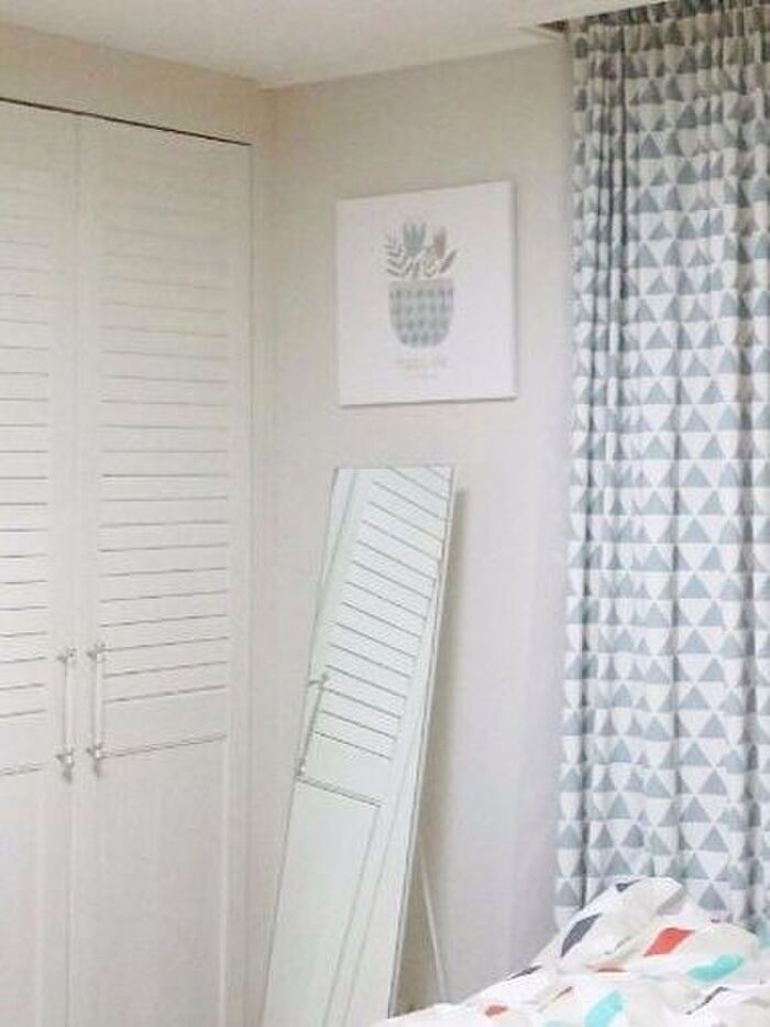 ベッドルームのデッドスペースに、部屋のスタイルに合わせたパターンデザインのファブリックパネルをチョイス。ナチュラルな優しい雰囲気をプラスしています。