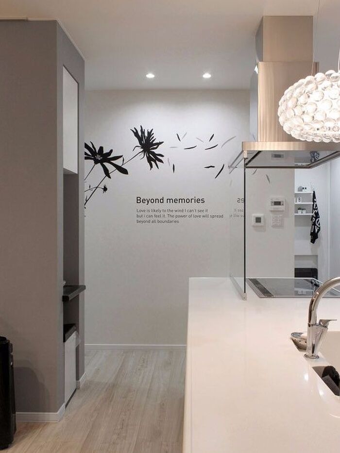 キッチン、リビングへ続く廊下の壁部分を、花デザインのウォールステッカーでドラマチックにアレンジして。これだけで空間がぐっと華やかな印象になりますよね。
