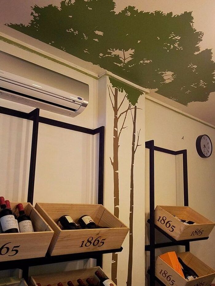 ウォールステッカーは、デザインを選べばどんな空間にも飾ることができます。柱と天井をうまく利用して、ワインセラーがまるで森の中のような癒しの雰囲気に。