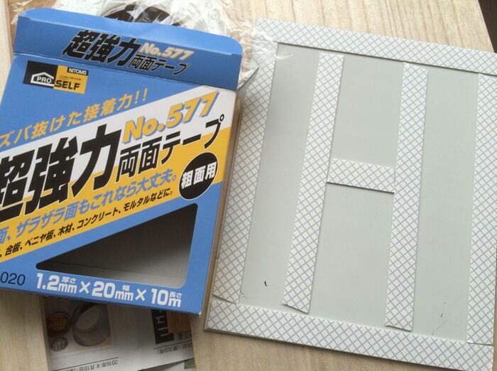 ミラーは外れないように、超強力両面テープでベニヤ板に貼ります。