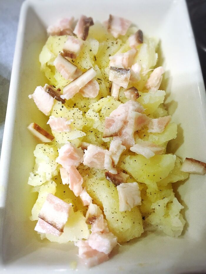 くり抜いたジャガイモにも同じようにオリーブオイル、塩、ブラックペッパーで味付けします。