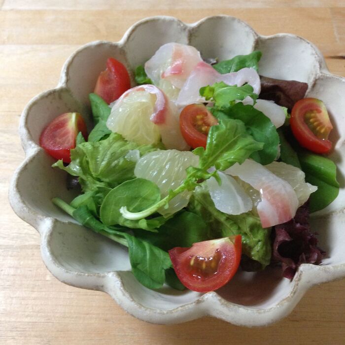 真鯛は薄く食べやすい大きさに切り、ミニトマトは4等分、グレープフルーツは房から出して、1/2~1/3の大きさにそれぞれ切ります。
